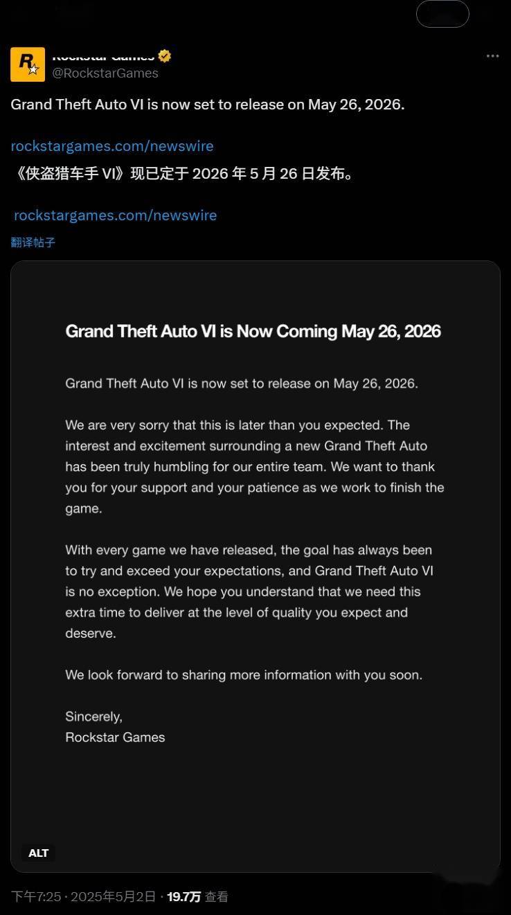 R 星在公告中对游戏延期进行了致歉,目前游戏仍在完善中,官方需要额外的时间来达到玩家的期望和应有的品质。IT之家附公告机翻内容如下: