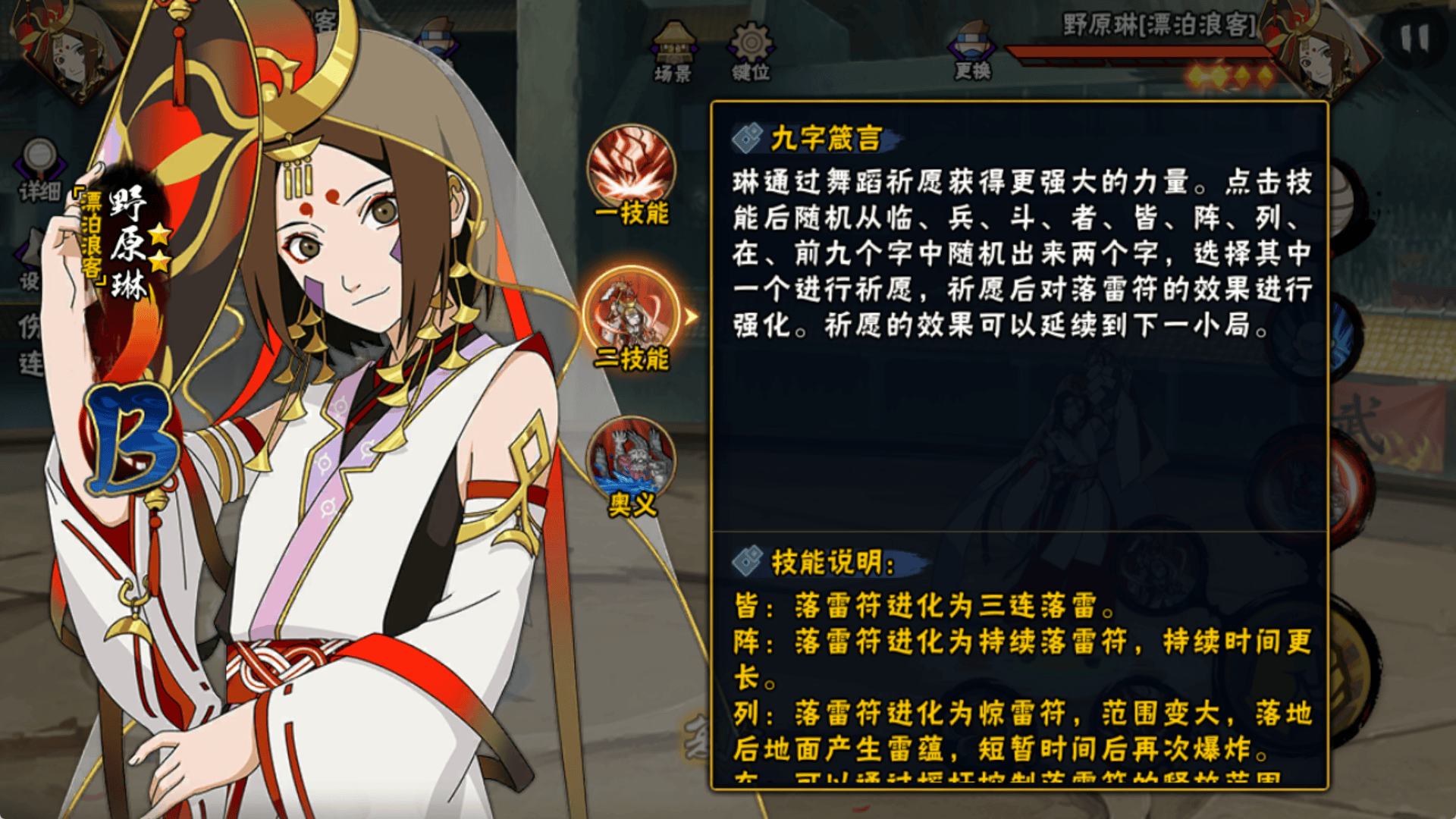 漂泊野原琳在上周就上架了,但经过了一周的时间才能拿到,这个免费的B忍强度如何?下面来分析一下。首先,这个忍者的强化机制比较简单,但又存在随机性,因为她的一技能是固定的落雷攻击,点击二技能会随机出现两个字,通过不同的字来强化一技能的效果。所以,这个忍者看起来就是一个二技能强化一技能的机制,但因为出现的字是随机的,你无法自由选择,而且还需要集齐完整的九字箴言才能达到最强的效果,一般是到第二个忍者才能有满强化的状态。