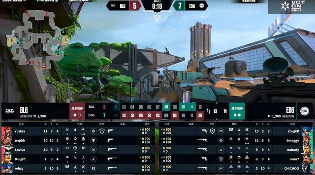 上半场BLG赢下手枪局,EDG从奖励局开始拿分,EDG在拿到信息之后,回去选择转点进攻,开局的慢节奏进攻,让Levius零的拌线毫无效果,EDG对于零的防守拌线预警很强,在拿到信息之后转点安包打BLG的回防,这让EDG连拿五分。第8回合BLG暂停起到效果,BLG在A小直接前压大对枪,通过技能的协同铺盖,BLG成功拿下这分。第9回合EDG打A失败,双方残局就剩下nobody与rushia,nobody极限时间进点转身一枪打掉rushia,EDG连拿两分后,最后一个回合被BLG赢下。上半场EDG 7-5 BLG。