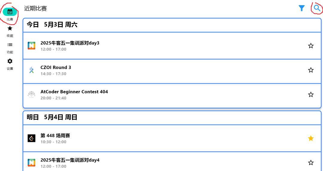 点击左上角的“比赛”,再点击右上角的漏斗,显示有比赛的OJ,有洛谷、牛客、AtCoder、力扣、codeforces、蓝桥: