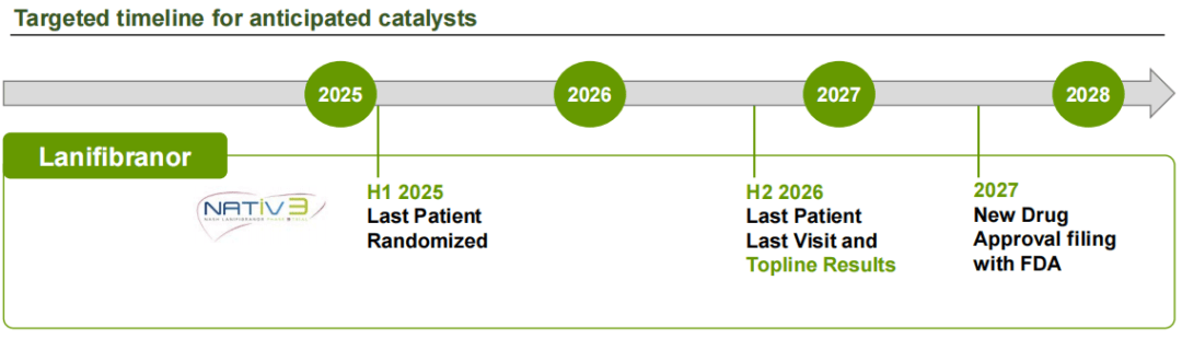 根据最新披露信息,NATiV3研究的患者筛选工作已在2025年1月初完成。超过95%的目标患者数量已完成随机分组,预计将在2025年上半年完成全部入组工作。NATiV3的总体结果预计将在2026年下半年公布。若进展顺利预计在2027年向美国FDA递交NDA申请。