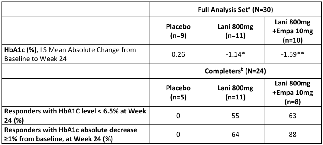Inventiva还开展了一项名为LEGEND的2期概念验证性试验,该研究旨在评估Lanifibranor与SGLT2抑制剂恩格列净联合用于治疗非肝硬化性NASH和2型糖尿病患者的安全性和有效性。2024年3月,Inventiva宣布LEGEND研究获得积极结果,达到主要疗效终点:在第24周,接受Lanifibranor(每日800 mg)单药治疗或与恩格列净(每日10 mg)联合治疗的NASH和T2D患者的糖化血红蛋白绝对值分别下降了1.14%和1.59%,而安慰剂组则上升了0.26%。