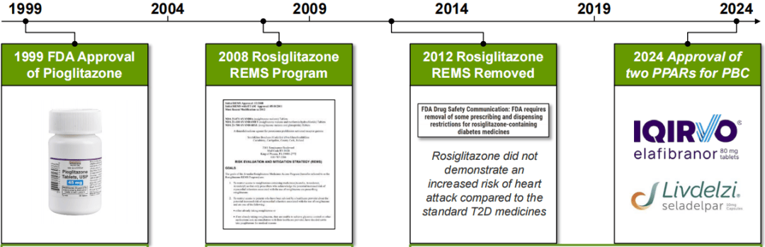 1999年,武田制药的PPARγ激动剂吡格列酮获美国FDA批准,用于治疗2型糖尿病,但其疑似的膀胱癌风险和心脏毒性副作用削弱了业内对于PPAR激动剂的认知。2008年,由于对葛兰素史克的PPARγ激动剂罗格列酮潜在心血管风险的关注,FDA实施了风险评估与缓解策略(REMS),以管理其使用并减少可能的风险。这再次给PPAR领域蒙上了阴影。到了2012年,基于新的证据,原先针对罗格列酮的安全性限制被移除,以及在2014年,新的荟萃分析显示吡格列酮与膀胱癌之间并没有关联,终于为PPAR靶点正名。