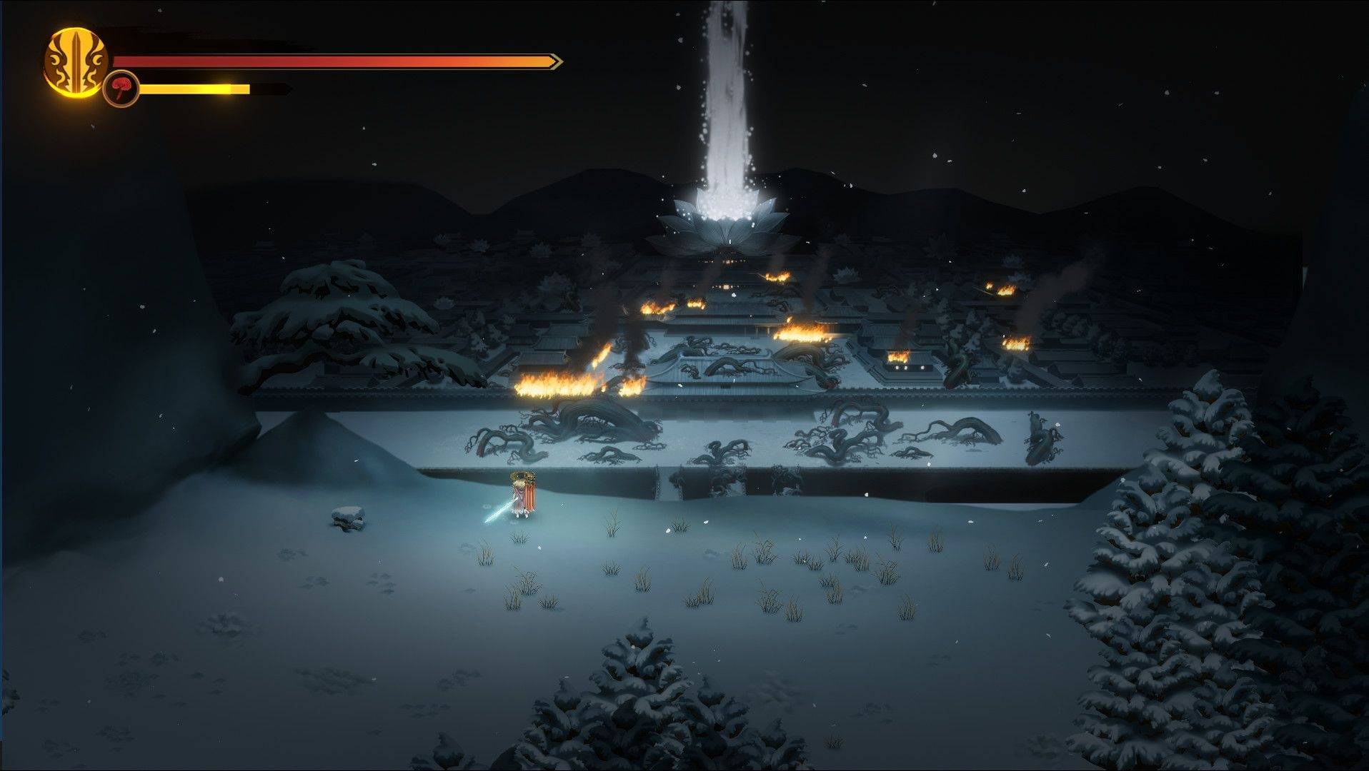 从初出茅庐到自成一派,烂泥工作室的《暖雪》算是在国产独立游戏圈子里站稳脚跟了。相比于《无间冥寺》一上手就是高难度,《暖雪》反而在初章时低于动作游戏的平均难度,基本上稍微玩过游戏的都可以顺利通关第一章,在一顿就这的疑问中感受第二章回归正常难度后的游戏体验。由繁化简的战斗系统只有两套攻击动作,远程飞剑和近战砍杀,在此基础上通过各种衍生元素比如圣物、神兵、宗派等强化玩法,同时也算是把肉鸽元素放在了核心位置,突出了肉鸽带来的期待值和不同风格的操作体验。对比同赛道游戏,《暖雪》的美术风格相对锐利,精细线条偶尔会带来一些奇怪的视觉效果,但好在它对国风进行了不错的诠释,大量运用的国风动画演出、剪影和东方建筑美学,以及六月飞雪的暗黑武侠奇幻东方故事,都给游戏的艺术表现力增色了不少。