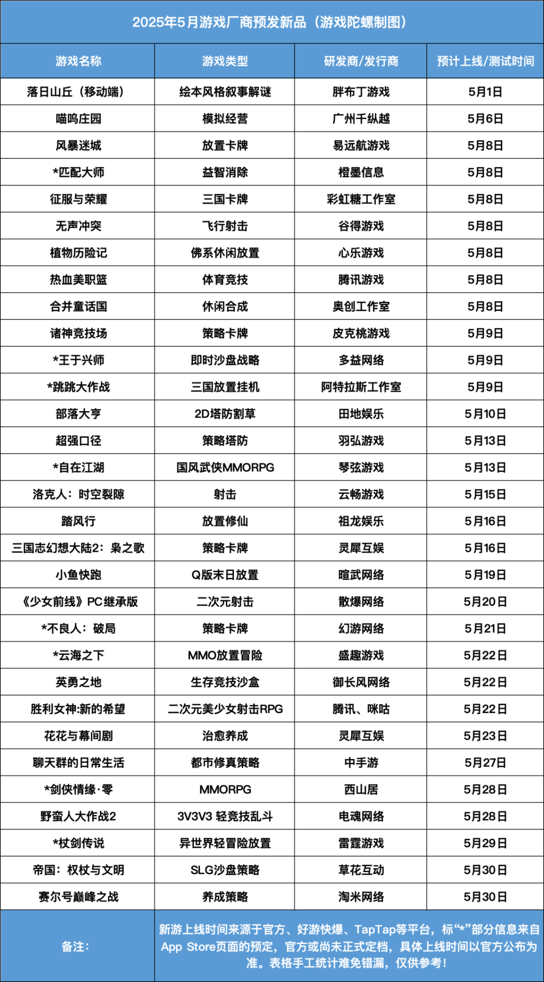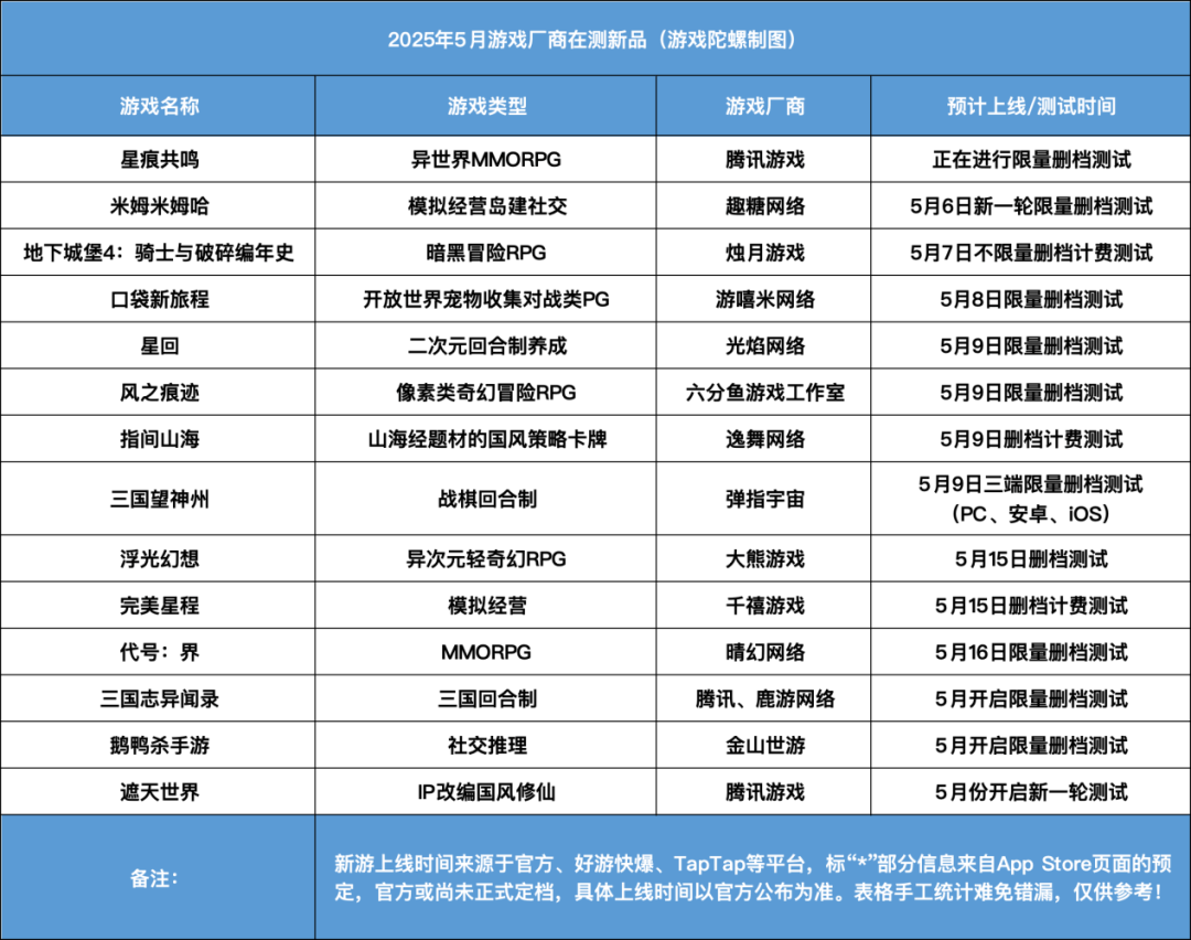 需要注意的是,已定档的游戏外,陀螺君统计5月正在测试或将开启限量测试的新游,共计14款。