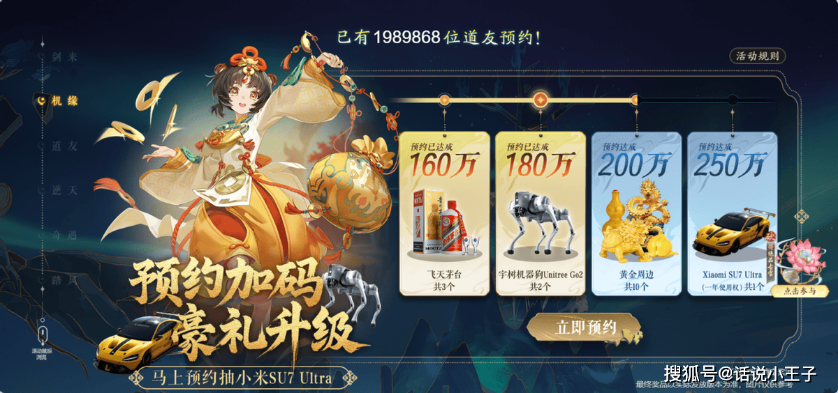说到这里,相信各位道友已经迫不及待想去预约《踏风行》了。让人惊喜的是,《踏风行》准备的预约福利着实逆天:预约即送海量虚拟道具,助你成仙破境快人一步;若官网预约总人数达标,还会开启飞天茅台、宇树机器狗、小米su7 ultra/问界 M9一年使用权等劲爆好礼的抽奖!