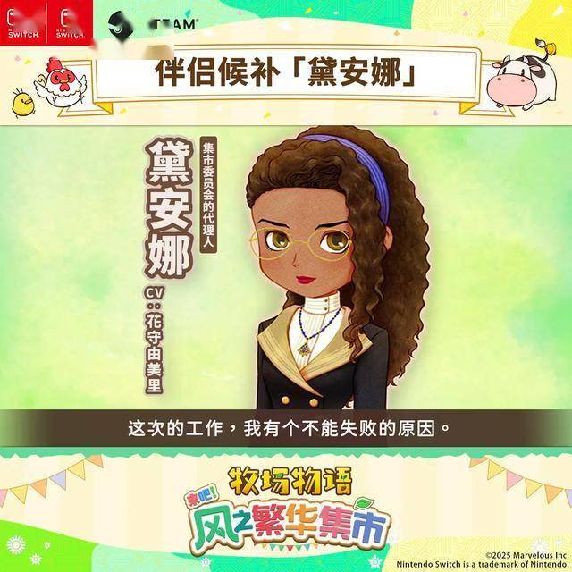 5月8日,开发商Marvelous发布了《牧场物语来吧!风之繁华集市》的全新伴侣介绍影片:黛安娜 (CV:花守由美里),展示了该角色的部分主线剧情与恋爱剧情画面。《牧场物语 来吧!风之繁华集市》预计将于8月28日发售,登陆Switch、Switch 2和Steam,支持中文。