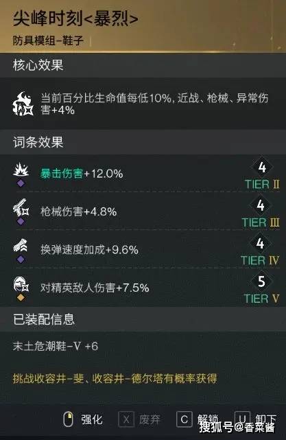 模组的等级主要由模组下的小词条等级来区分,白色为一级,绿色二级,蓝色三级,紫色四级,金色五级。金色品质不能通过刷取得到,必须强化。所以,可以刷取到的最低等级模组为4级(四白模组),最高等级游戏有限制,为12级(紫蓝蓝绿,四蓝)。知道了等级我们再来说一下强化。