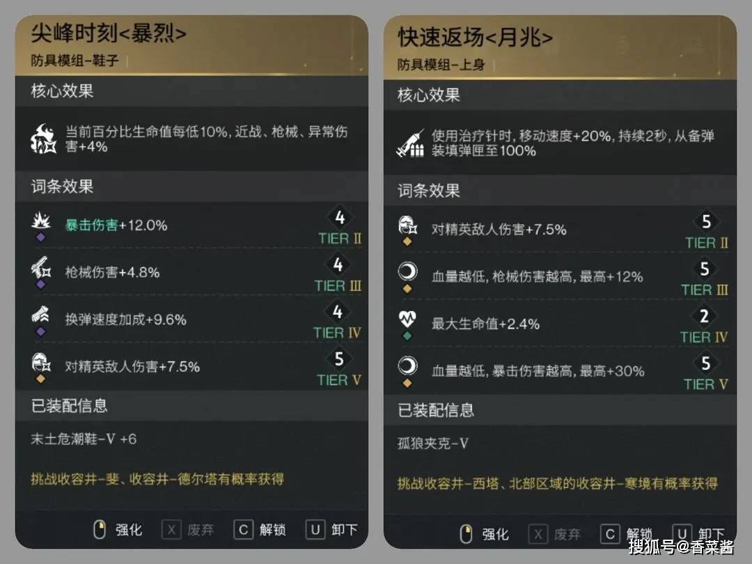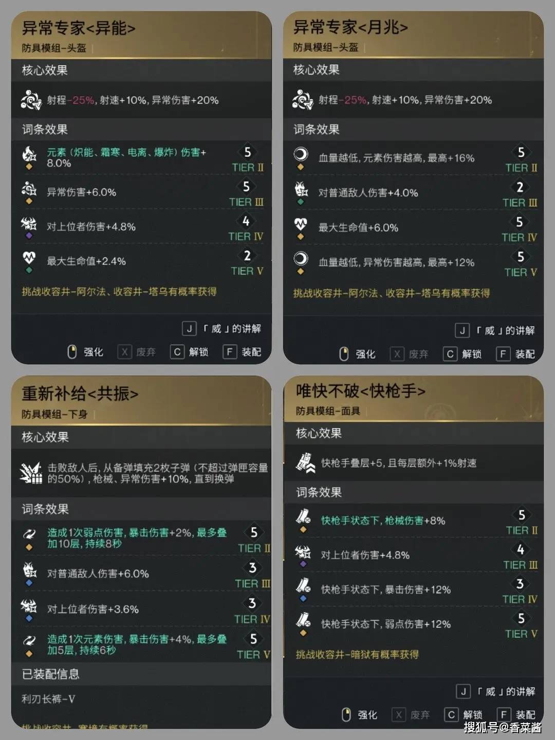 四种后缀的效果各不相同,普通的效果特点为加成稳定,但是数值平庸,月兆模组的特点为数值加成暴力,但是触发条件苛刻,共振模组特点为能为单一属性拔高,但是适用面窄,专属各方面都很完美,但是难刷取。大家可以图文结合方便理解。↓