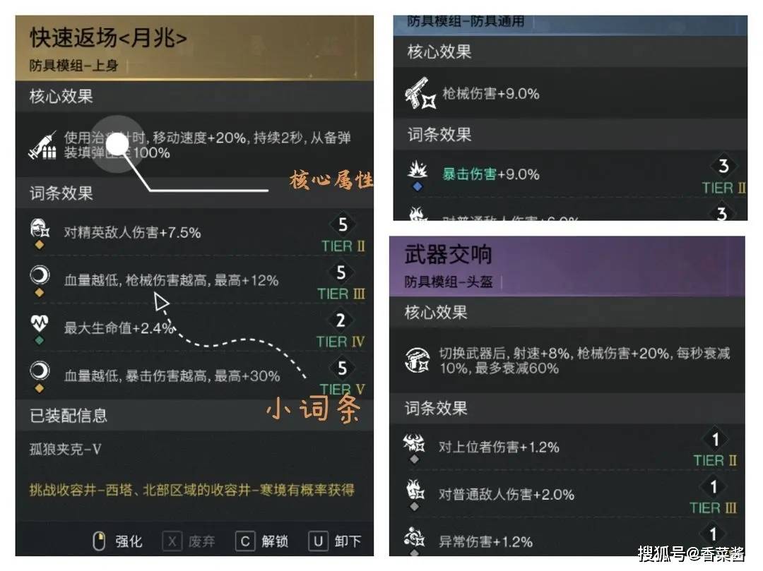 每个模组都有自己固定的核心属性,还会携带数个随机小词条,金色模组携带四个,紫色三个,蓝色两个,绿色一个。这个小词条便是拉开战斗力的指标,刷模组刷的便是这个。