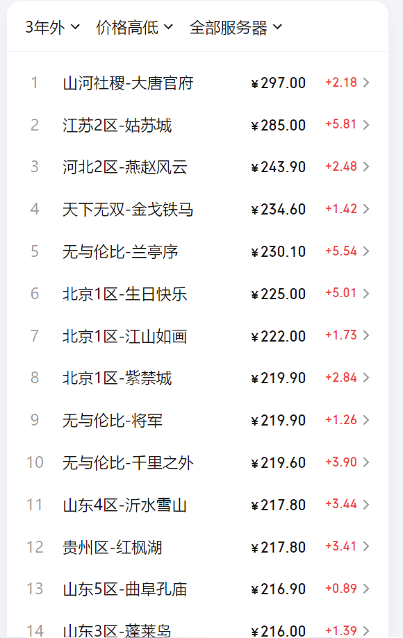 在近期的更新中,官方不仅修改了天命副本的结算奖励,而且严厉打击鼠标宏、虚拟机等违规游戏行为。这样一来吸引了众多老玩家回归,并且打压了工作室的行为,从而刺激了金价上涨。以三年外服务器金价为例,平均涨幅约3元。排在前十的基本都能突破220元了,而大唐官府和姑苏城一路领跑,彼此都非常接近300元。