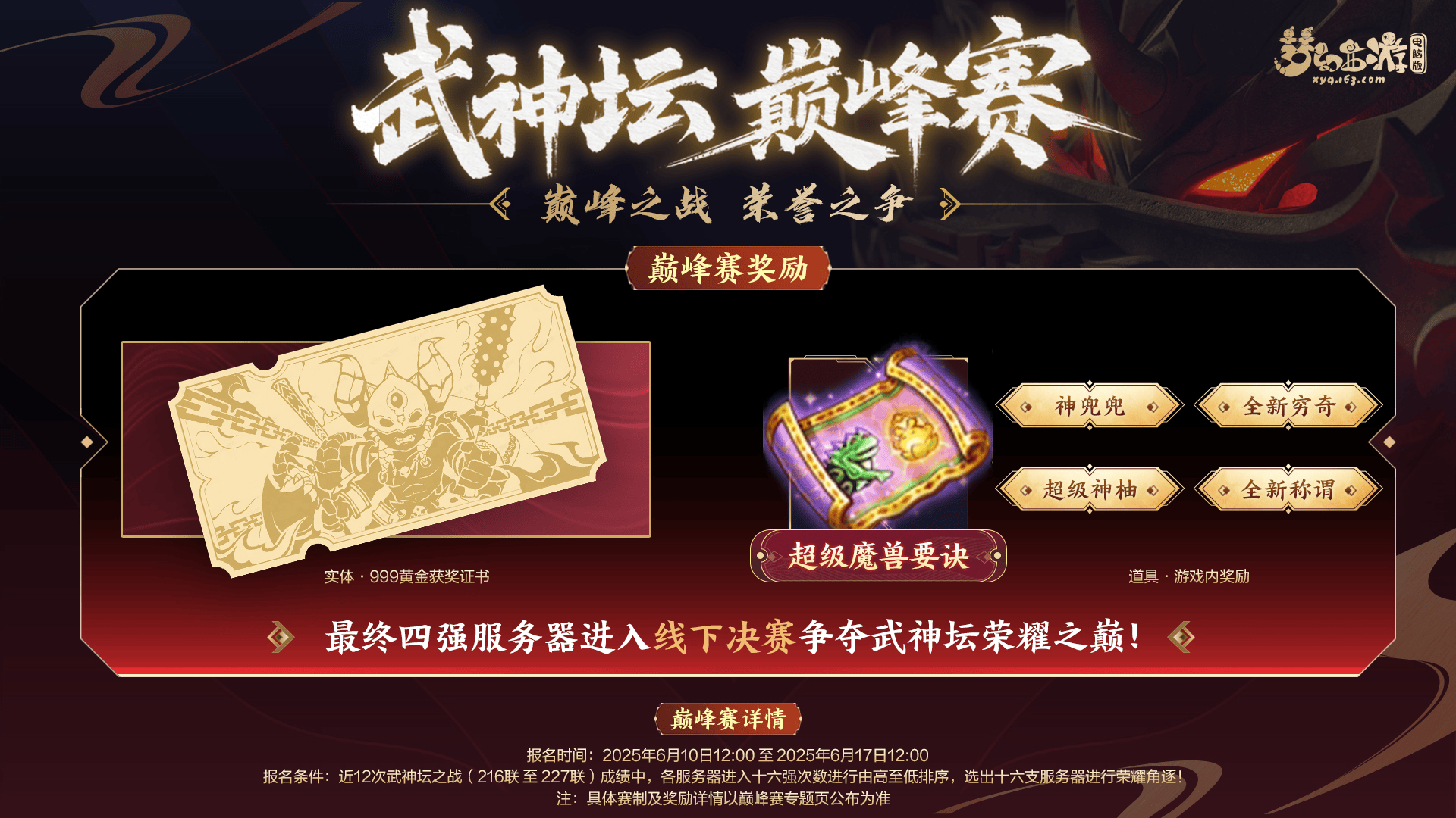 继火焰新秀赛后,官方本年度再次推出新的赛事,就是武神坛巅峰赛。简单来说,这个比赛会在年中举行(报名时间6月10日-6月17日),根据过去12联比赛的成绩,挑选十六支服务器队伍进行荣耀角逐,拿到前四名成绩才能获得线下资格,争夺最后的总冠军!
