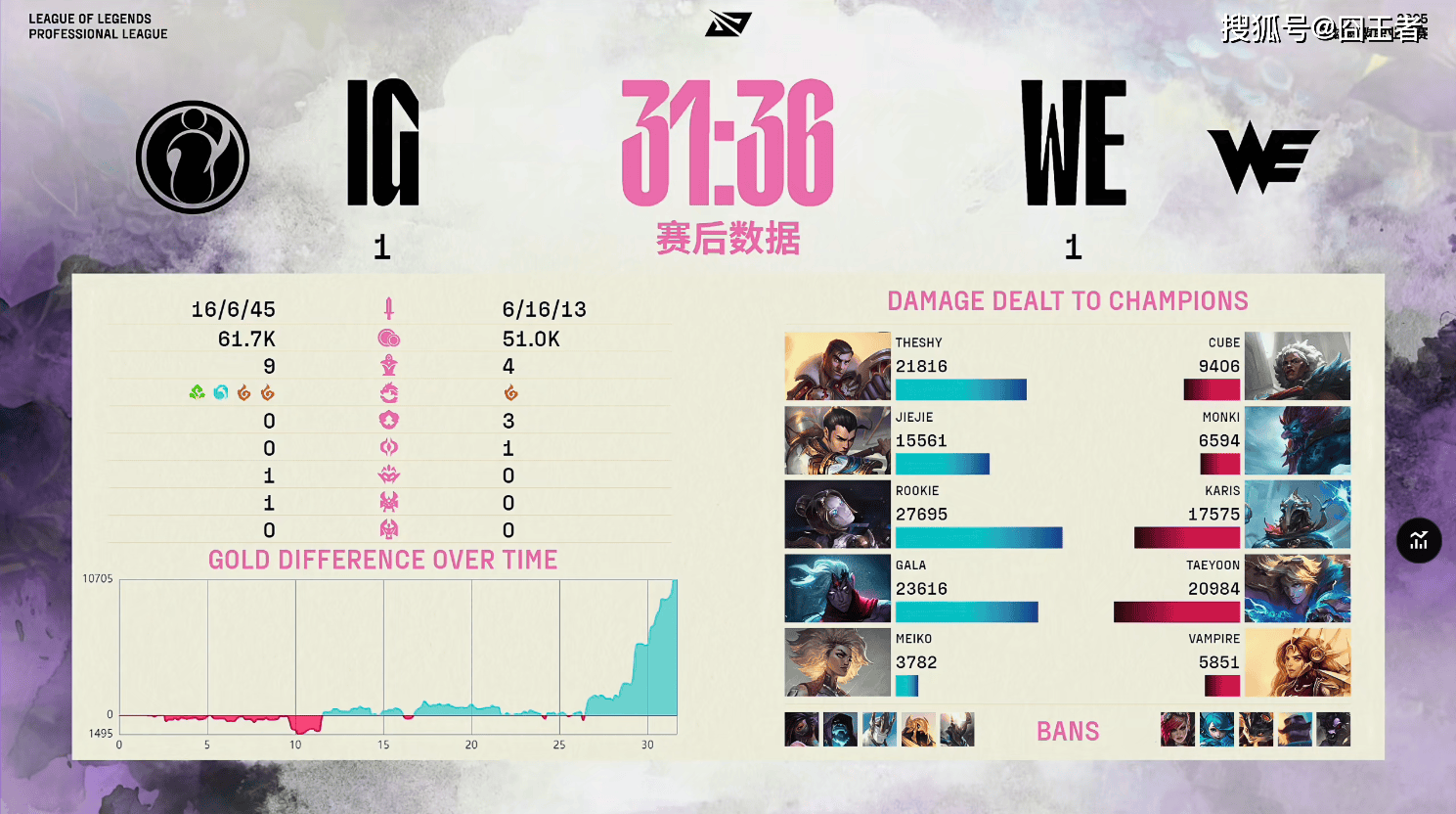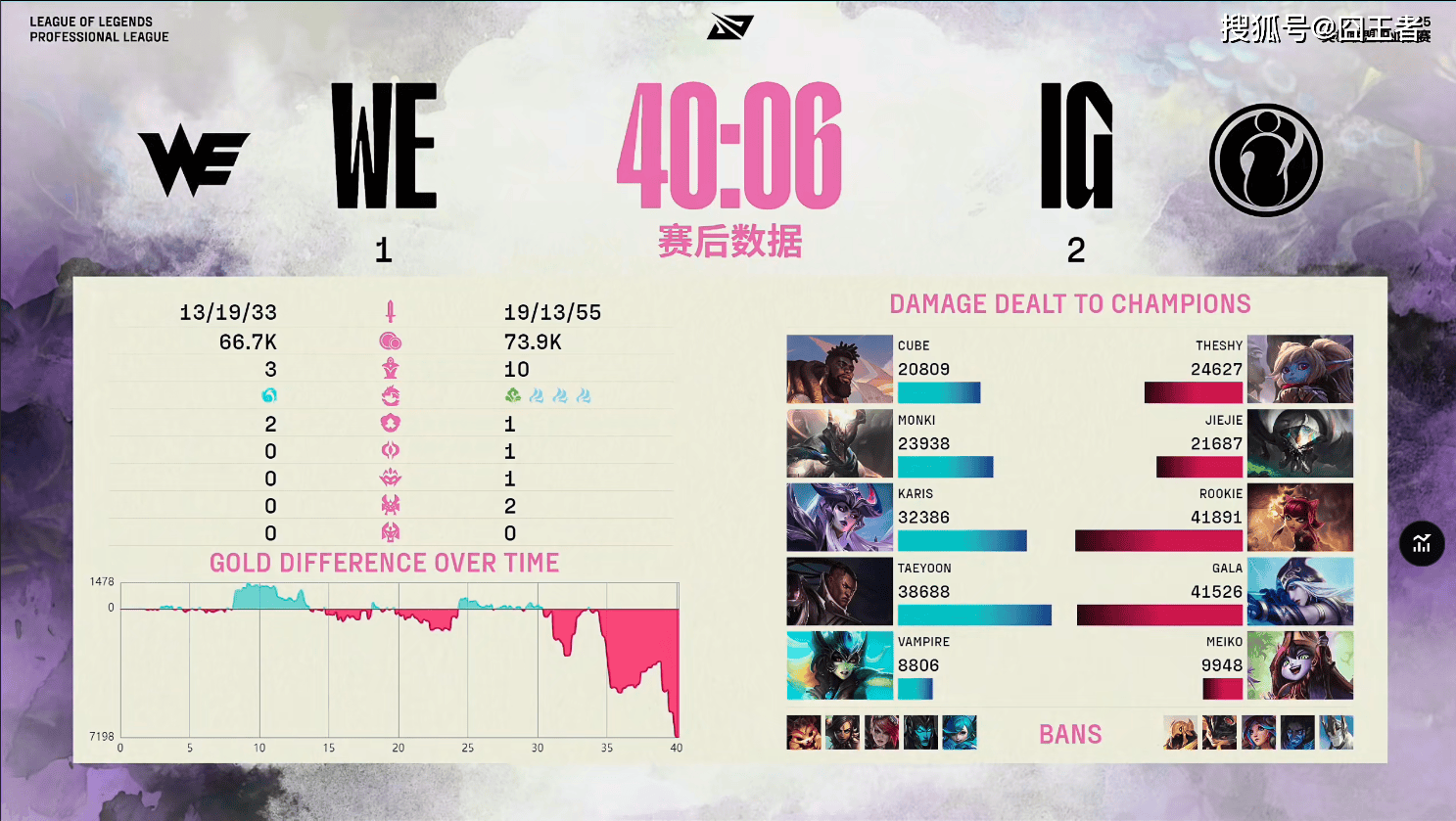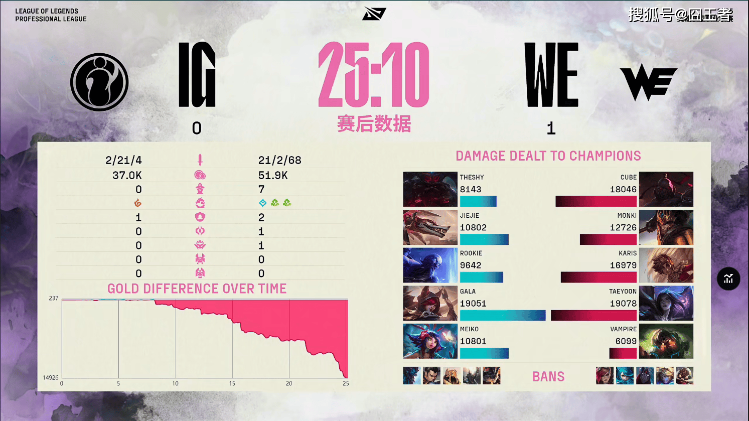 结果第一局比赛,IG被25分钟速通!8分钟左右:WE抓住机会果断反打,顺利打出0换2;13分钟左右:WE小龙团抢下小龙,随后反打成功击杀IG多人大获全胜;16分钟左右:Taeyoon卡莎大招进场向前闪现,WE团战再次大获全胜;21分钟左右:WE下路抓住机会果断开团,打出0换4随后拿下厄塔汗;最终25分10秒:WE野区果断开团,控制链完美衔接成功击杀IG多人随后顺利一波结束比赛。