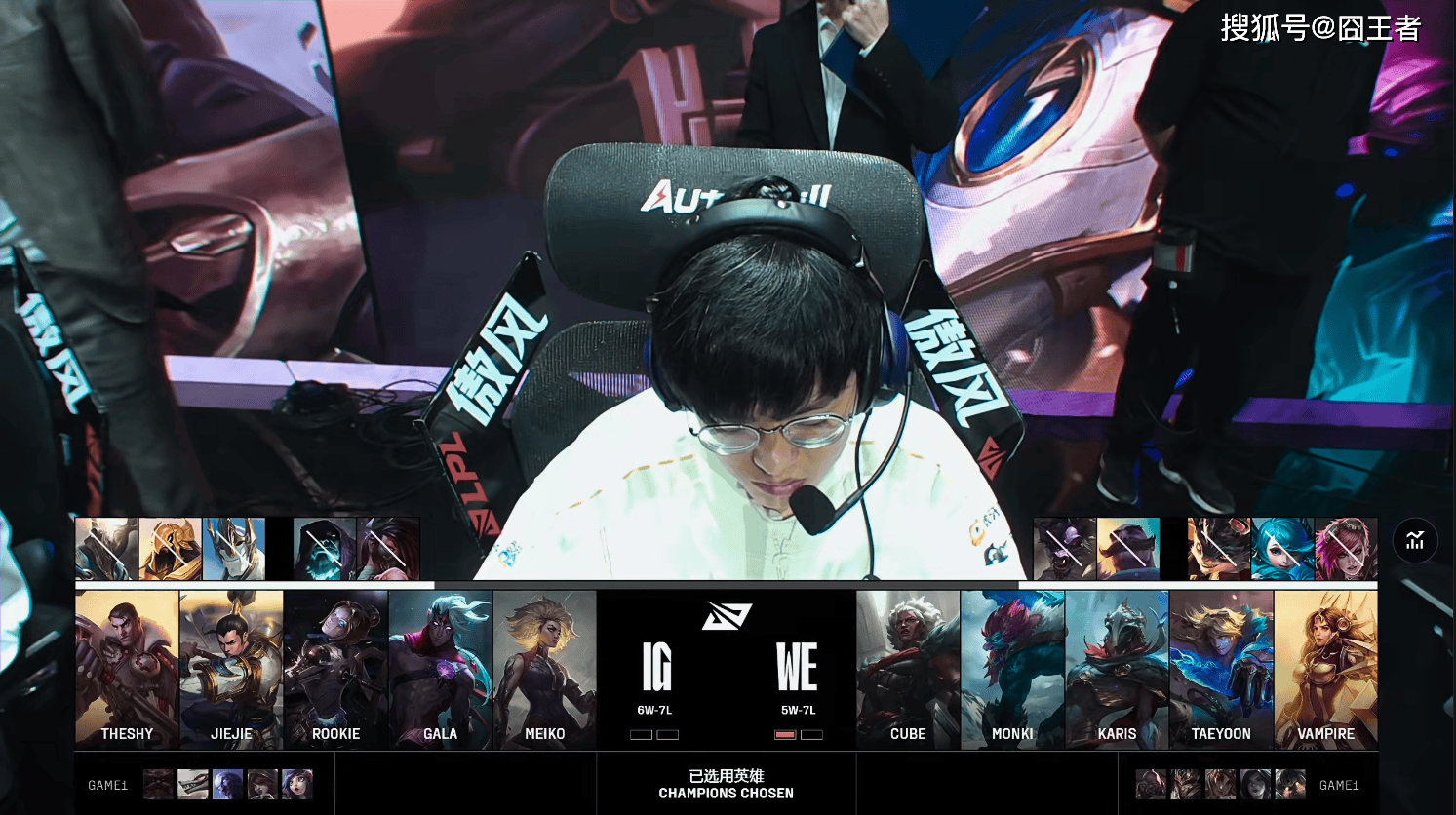第一局比赛,IG蓝色方,禁用:兰博、潘森、沙皇、赵信、巨魔,选用:TheShy奥恩、Jiejie纳亚菲利、Rookie瑞兹、GALA霞、Meiko妮蔻;WE红色方,禁用:蔚、格温、韦鲁斯、伊泽瑞尔、飞机,选用:Cube赛恩、Monki皇子、Karis岩雀、Taeyoon卡莎、Vampire泰坦