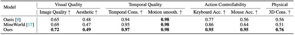 在这个基准上,Matrix Game 与知名创业公司 Decart 的开源方案 Oasis 和微软的开源模型 MineWorld 进行了 PK,在四大维度上均取得领先成绩。