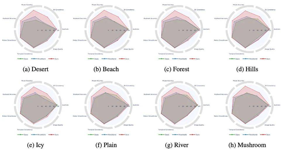 接下来是场景泛化能力,在 8 大典型 Minecraft 场景中,Matrix-Game 保持了全面领先,展现出卓越的环境适应性,这意味着它可以广泛应用于较复杂、动态的虚拟世界交互任务。