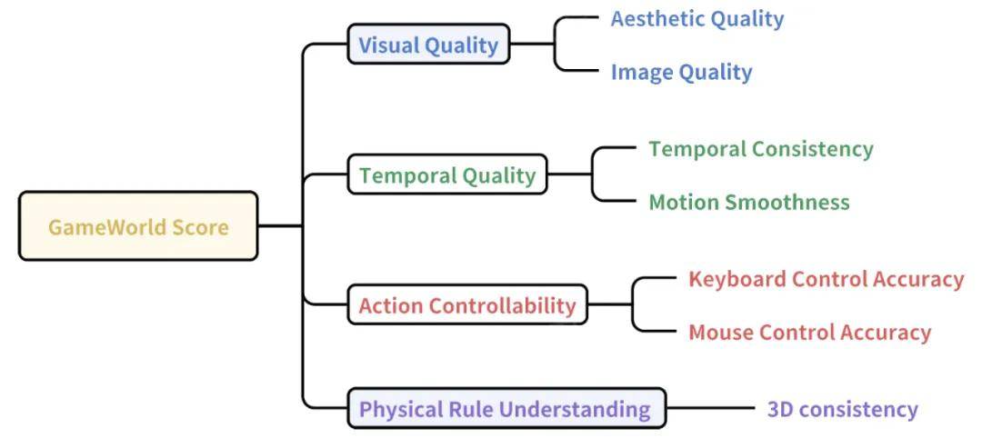 对于交互式视频生成这种相对较新的模型,应该从哪些维度评估生成质量?如果不想清楚这个问题,模型就很难有明确的优化方向。为了解决这一问题,昆仑万维提出了一套专为 Minecraft 世界建模设计的统一评测框架 —— GameWorld Score。