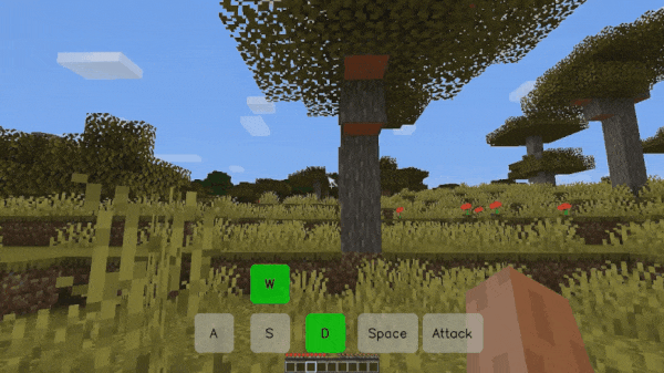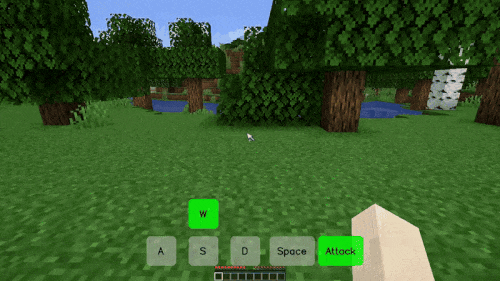 比如在下面这个「前进 + 攻击」的场景中,游戏人物穿过一片树林来到池塘前,代表树木的方块在受到攻击后被破坏,这是模型生成的环境反馈信号。而且,虽然池塘和后面的山体大部分被树木遮挡,但模型依然生成了合理的结果,使得整个过程的景物变化非常丝滑。
