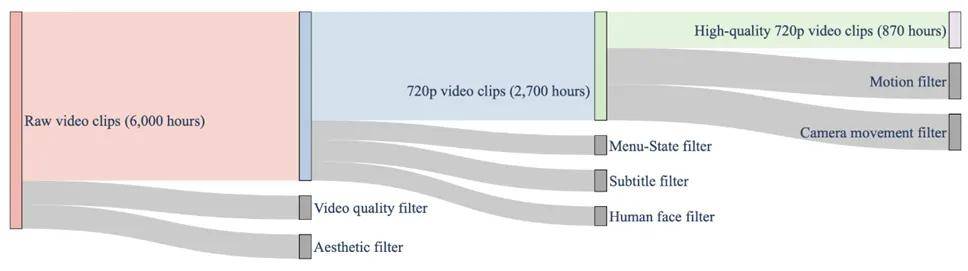 Matrix-Game-MC 数据集涵盖从无标签预训练数据到精细标注的可控视频全流程。其中,无标签预训练数据来自 MineDojo 数据集中的视频资源,研究团队利用 MineDojo 工具系统性地采集了约 6000 小时的原始 Minecraft 游戏视频,并设计了三阶段过滤机制,依次对画质美学、动态合理性与视角稳定性等方面进行筛选,最终获得了超过 2700 小时的中质量数据和 870 小时的高质量数据,用于支持基模型的无监督预训练。