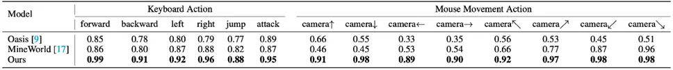在控制性上,Matrix-Game 在「运动」、「攻击」等动作上实现了超过 90% 的准确率,细粒度视角控制下依然可以保持高精度响应。
