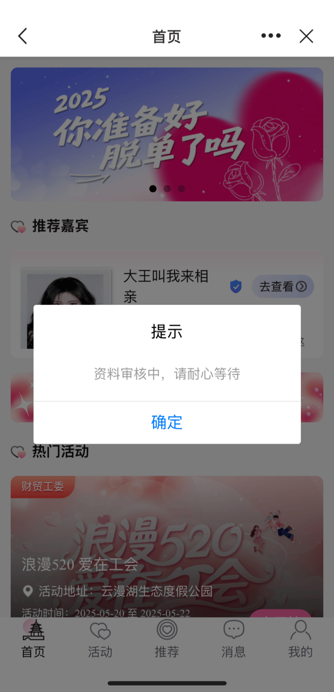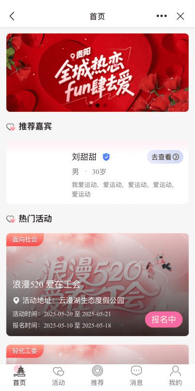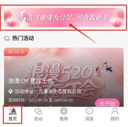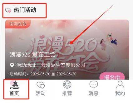 1、进入活动报名页——找到首页“热门活动”中的“浪漫520 爱在工会”或点击底部菜单栏“活动”进入活动列表页,点击对应活动进入报名页。