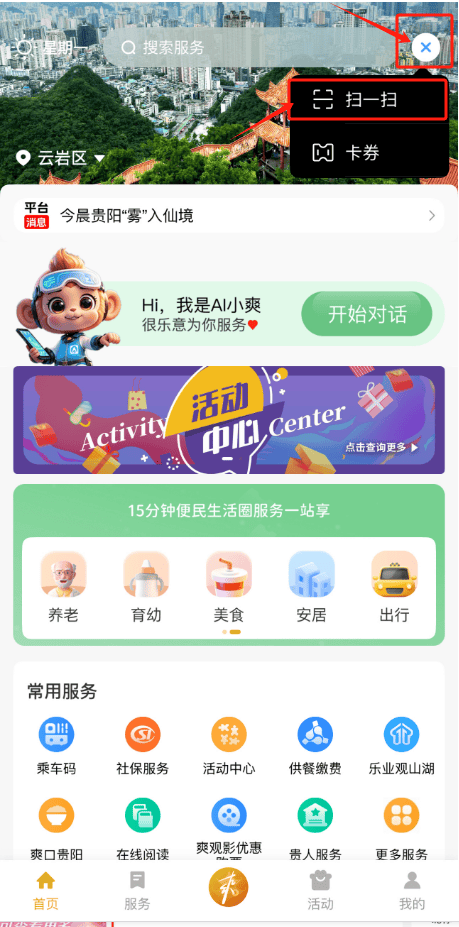 手机应用商城搜索或扫码下载“爽贵阳”APP(如已下载APP,可跳过步骤一)