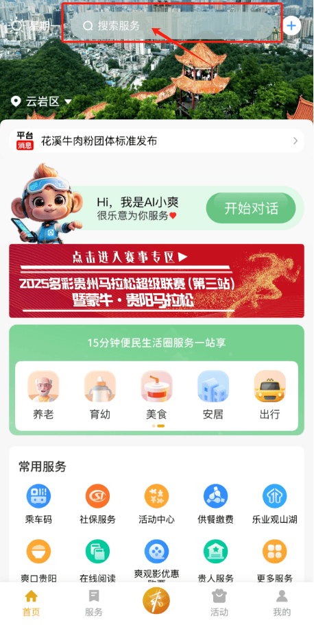 方式一:打开“爽贵阳”APP,在顶部搜索框输入“相亲服务”,点击进入。