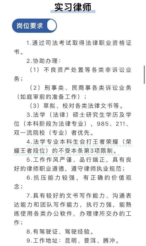 5月12日,云南一律所发布招聘公告,在招聘实习律师的岗位要求中写道:“法学专业本科生会打王者荣耀(荣耀王者段位)的不受本条第3项限制”。