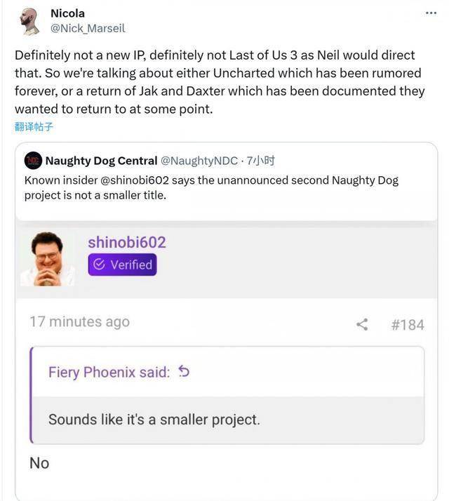 粉丝推测,新作应该不会是《最后的生还者3》,因为如果是《最后的生还者3》,尼尔会亲自把关,但昨天尼尔已经表示他在这个新作上只是制作人,而不是游戏总监。因此顽皮狗新作推测可能是《神秘海域》或者是回归老IP《杰克与达斯特(Jak and Daxter)》。
