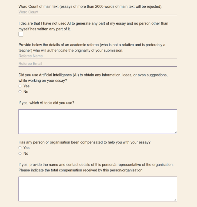 今年需要填写推荐人及邮箱地址:参赛者需要提供推荐人(学校老师或其他非亲属成年人)邮箱地址,推荐人将收到官方链接验证文章是否为参赛者原创。
