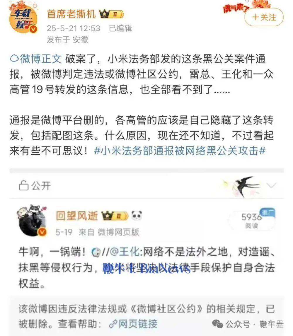 5月21日消息,小米法务部此前发布的破获网络黑公关微博已被删除。微博给出的理由是违反社区公约相关规定。