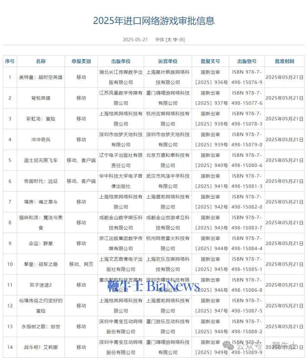 国家新闻出版署发布2025年进口网络游戏审批信息,5月共14款进口游戏获批。今年以来,共有44款进口游戏获批。