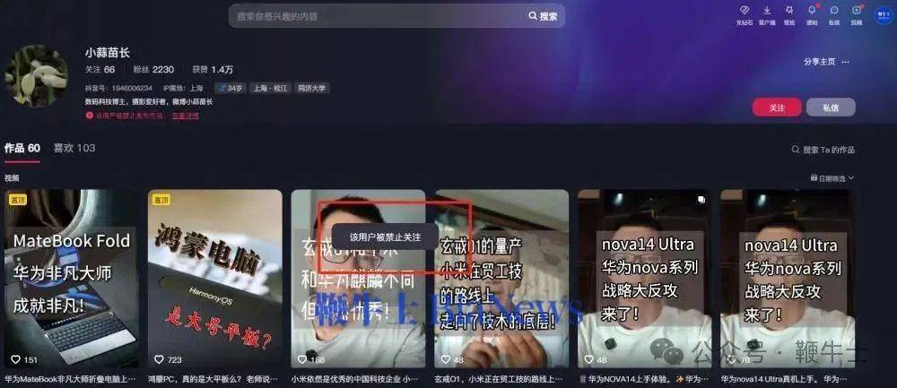 2、知名博主「小蒜苗长」多平台被禁止关注