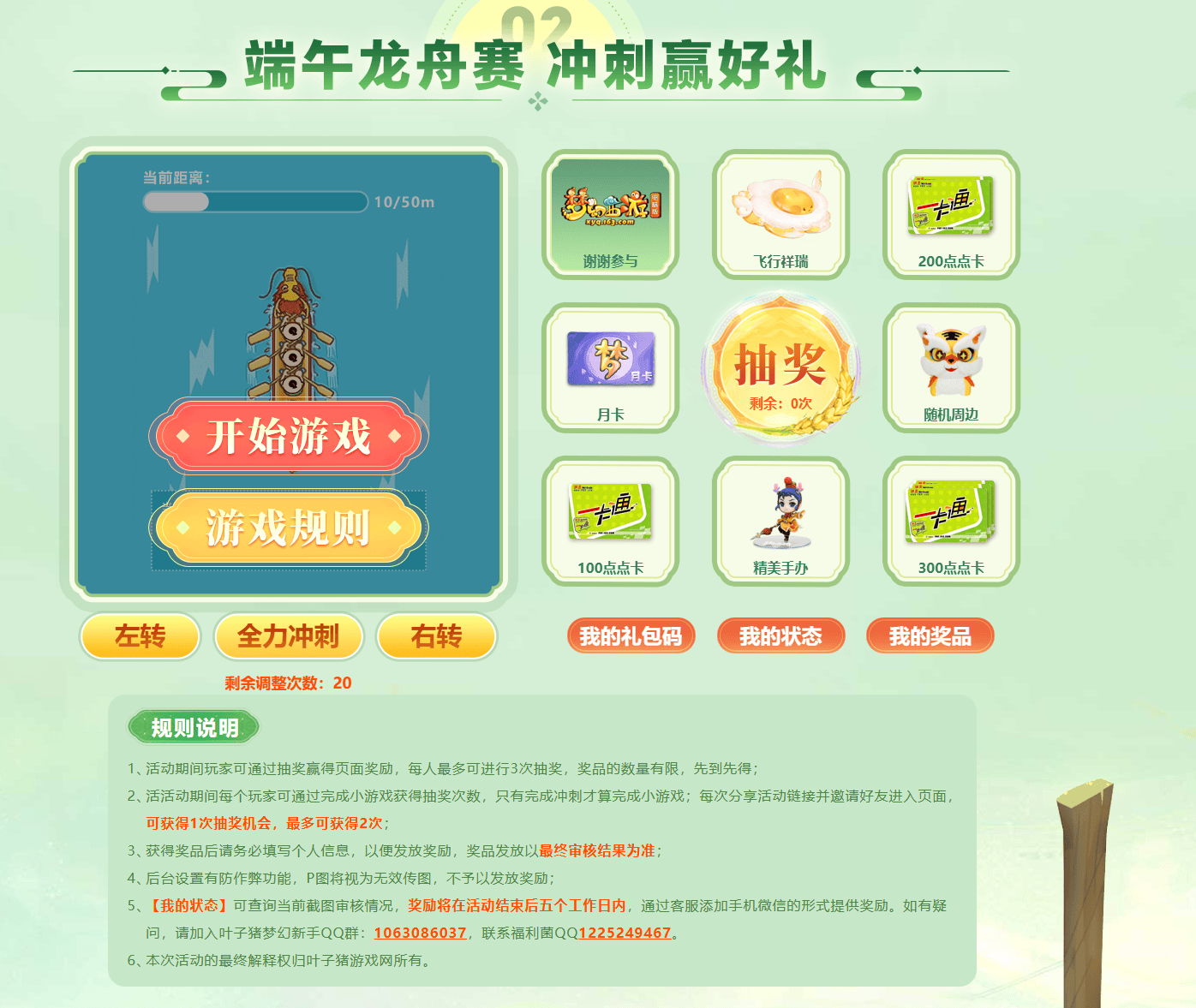 除此之外,还可以参与“端午龙舟赛”活动抽取奖励,大家可以通过完成小游戏、分享活动链接的方式获得抽奖次数,每人最多可进行3次抽奖,奖品池内可以抽到月卡、周边、手办、点卡、飞行祥瑞等奖励,数量有限、先到先得哦!