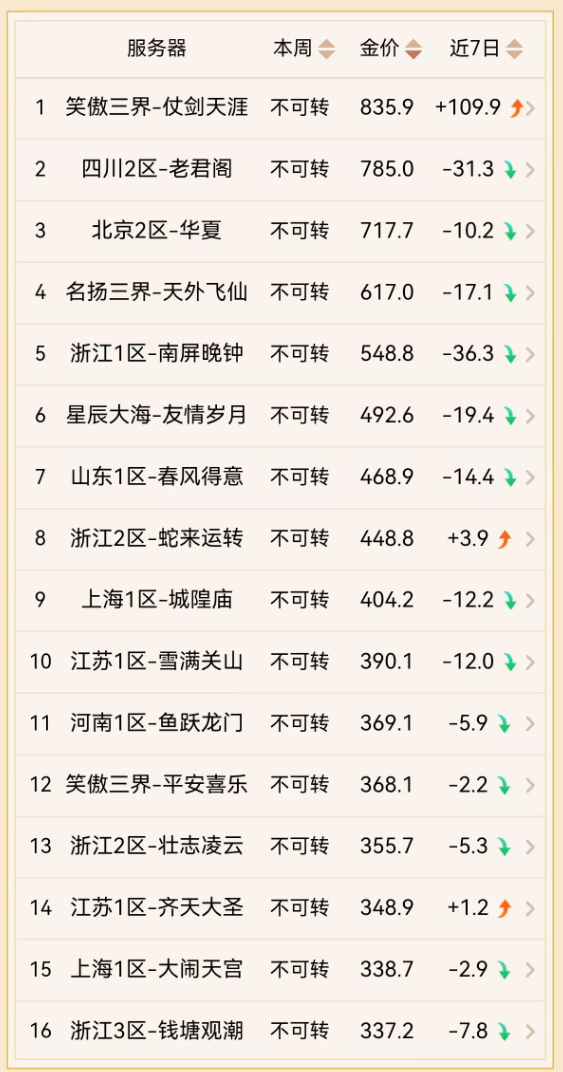 而且,由于梦幻西游对新区经济体制的不断改动,目前大多数新区都能在开服一年内保持较高的金价水准。比如,【齐天大圣】服务器的开服时间为2024年9月,到2025年5月时,其金价基本维持在350R左右,比三年外金价第一的服务器还高50R。