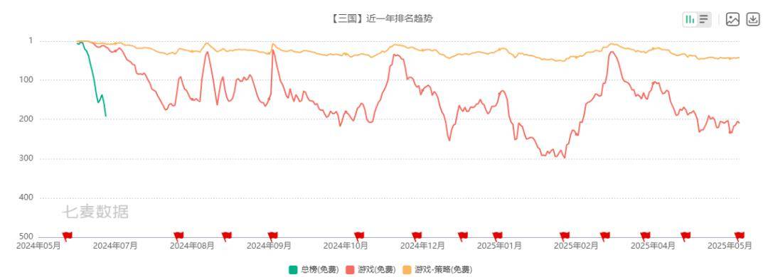 据七麦数据,《三谋》自上线起在iOS游戏免费榜上的排名呈震荡下滑趋势,这其中存在以赛季为主的新内容吸引玩家回流的因素,但总体上玩家大盘仍处于流失中。
