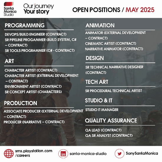 值得一提的是,此前曾有消息称,圣莫尼卡正在为未公布的新项目招聘多个职位,包括编程、动画、美术、设计等等。而就在去年9月,圣莫尼卡高级经理Albertina Chu的LinkedIn资料显示,该工作室有多个未公布的游戏正在筹备中,但圣莫妮卡官方对这些项目守口如瓶。