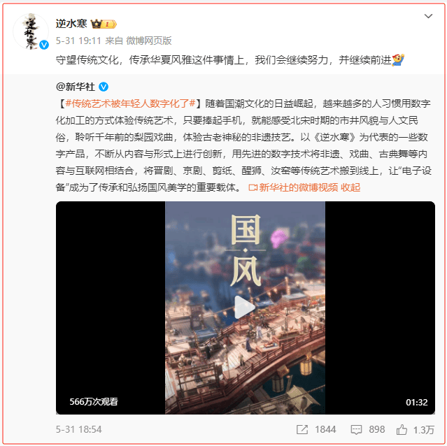 有人则看重宣传效果,将其归结为“国家队”的站台。《逆水寒》可以说是国内被主流媒体赞许最多、最有牌面的MMO了。游戏刚刚问世的2019年春节,就因为成功复原了大宋年味而被央视报道,此后又凭借着对公益事业的贡献和对国风美学的坚持,被新华社、人民日报等主流媒体赞扬。