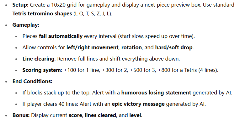 比如我们之前尝试用谷歌 firebase 纯自动搓出来一个简易俄罗斯方块,第一步就遇到了折磨的提示词难题。