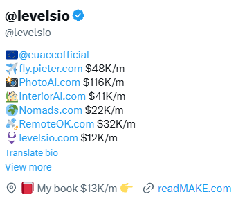看看发起人 levelsio 的简历,发现这兄弟可挺传奇的。工商管理出身,首页却挂着好几个月收入夸张的互联网项目。介绍里写着自己一年 12 次创业的逆天履历,看起来是个已经实现财富自由的成功人士。