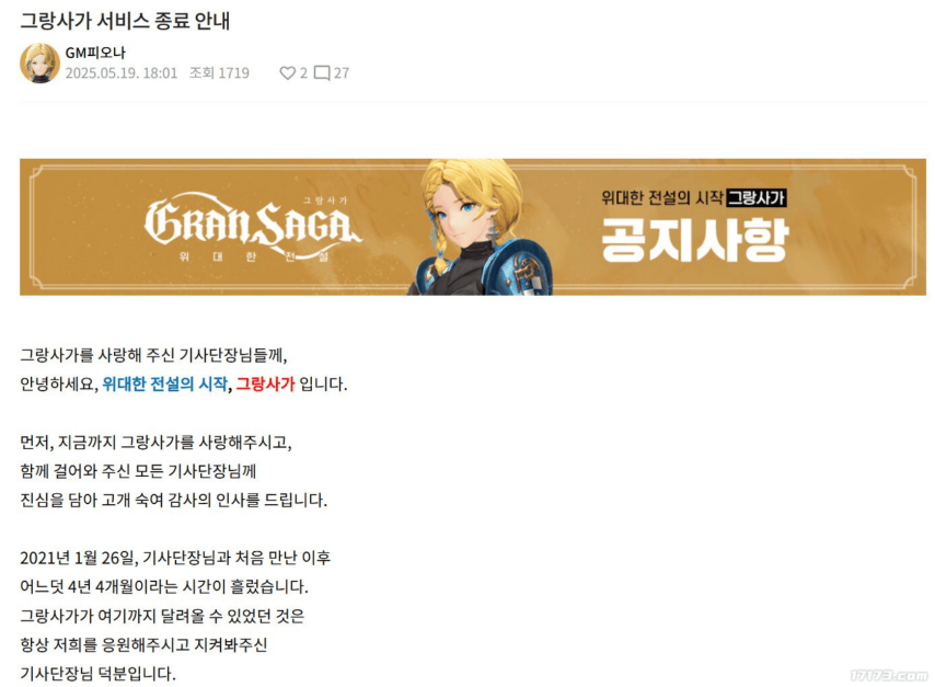 近日,韩国游戏公司Npixel通过官方论坛宣布,旗下MMORPG《Gran Saga(剑与骑士团)》将于8月28日正式停运。