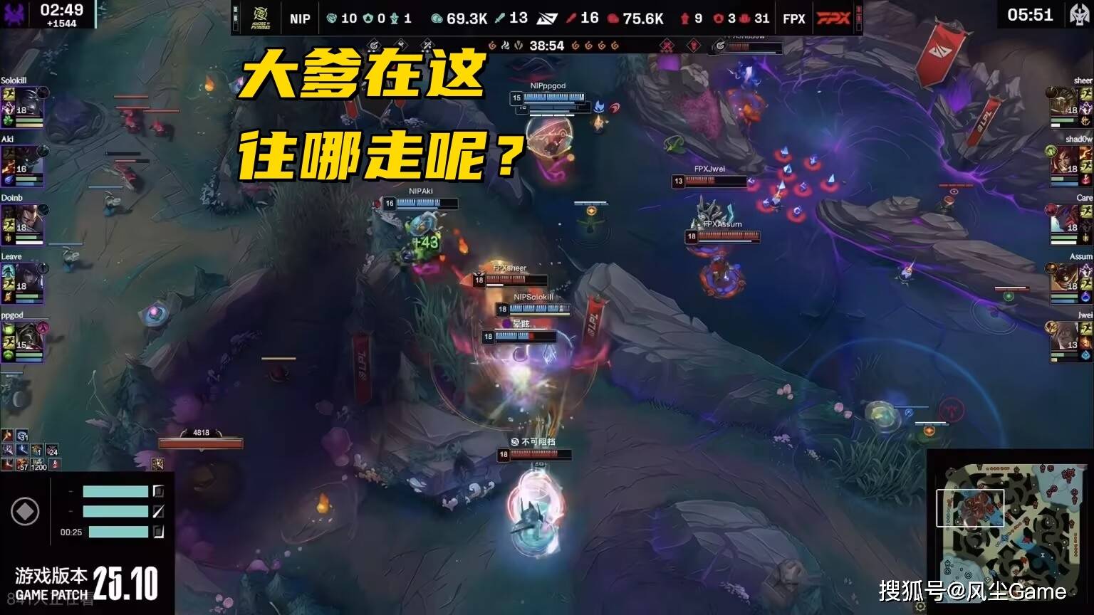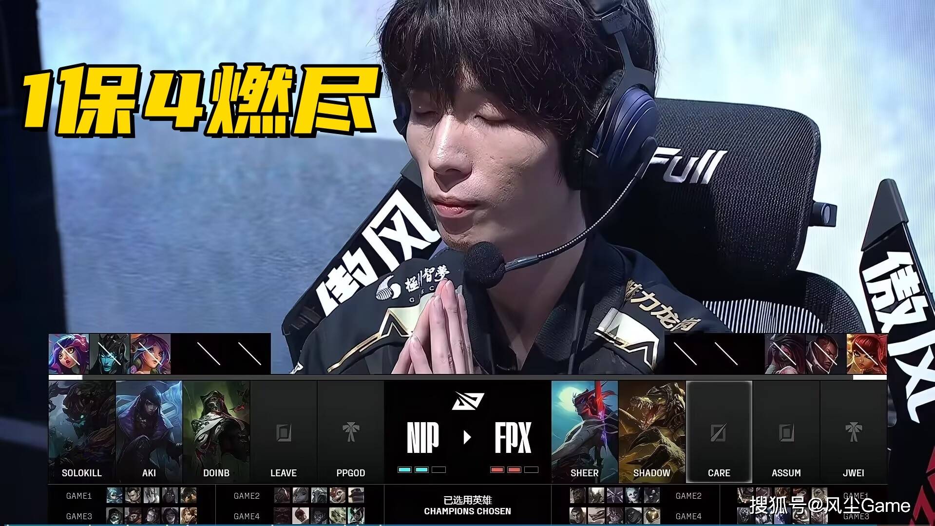 决胜局NIP除了Leave之外,几乎没一个像人的,PPgod的烈娜塔,保不住AD就算了,团战甚至连W都给不上,Doinb完全隐身查无此人,Aki不用说,送了半个赛季了,决胜局还在送,Solokill其实表现还可以,但最后一波决胜团,他的慎大招居然不保厄斐琉斯,这是真让人有点想不通。