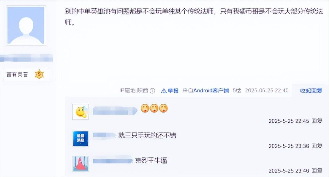 对此,有网友调侃说:“别的中单英雄池有问题都是不会玩单独某个传统法师,只有我硬币哥是不会玩大部分传统法师”。