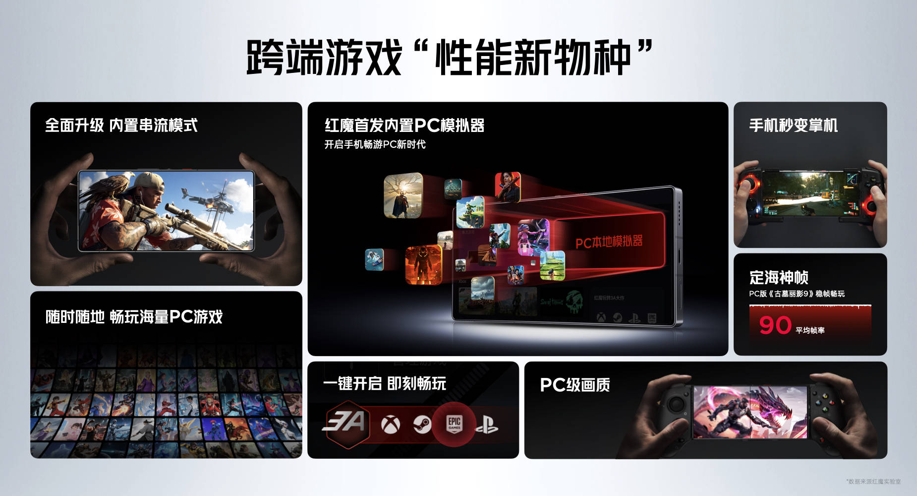 红魔10S Pro系列不仅在手机性能配置上尽显强悍,还实现了超越传统手机的功能突破,实现与PC游戏领域的跨越。通过自研转译引擎+跨端转译技术,打通技术壁垒,实现一机双端。整机借助红芯R3 Pro芯片增强画质,支持PC游戏一键直连,键鼠、手柄等外设即插即用,还有显示器投屏以及串流直连功能,深度集成PC游戏生态,首次实现手机端无缝畅玩PC游戏,开启移动端跨端游戏新纪元。