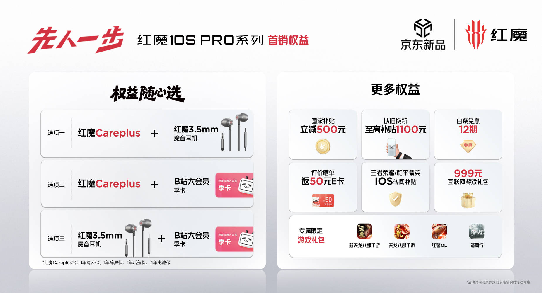 5月26日,红魔10S Pro系列在京东开启全球首发!现推出全球独家“先人一步新品尝鲜购”活动,上京东搜索红魔10S Pro,即可抢先体验新机。不仅如此,红魔10S Pro系列还带来了多重惊喜权益:首销用户下单即享权益随心三选一、至高享白条12期分期,以旧换新至高补贴1100元。此外,购买红魔10S Pro系列,还能解锁游戏世界福利,《新天龙八部手游》、《天龙八部手游》、《踏风行》、《红警OL》等热门游戏的精美道具免费送,助你畅玩无阻!