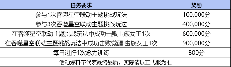 参与吞噬星空联动主题挑战玩法完成全部相关任务共可获得2,000,000念力,也就可以获取全部奖励啦。而念力训练则是十分有趣的弹幕射击小游戏,每日参与念力训练保底获得500念力,在游戏过程中随着不断击败虫族小怪和BOSS还可额外获得念力,赶快来大显身手吧!