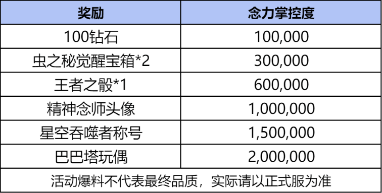 参与活动中念力训练的玩法,就可以获取念力掌控度,达到相应的档位即可领取奖励,具体可查看下图。需要注意的是,最终奖励巴巴塔玩偶需要完成一局吞噬星空联动主题挑战玩法才可以解锁。