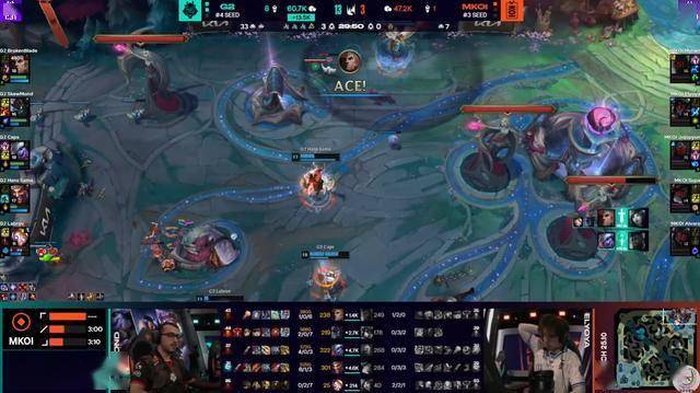 另一边就是Fnatic对战G2,欧洲比较经典的对决,最终G2以3-1轻松获胜。Fnatic和KC落入败者组,胜决就变成了黑马MKOI(也就是以前的MAD)对战G2。今天早些时候结束G2以3-1击败MKOI晋级决赛圈,同时拿到了MSI门票。