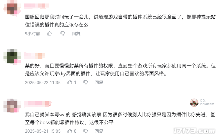 另一些人则觉得插件这件事禁得好,正是插件造就了玩家群体的不公平,有些人装了插件只需按照提示无脑走位按技能就行,但那些不装插件的人却需要大量的练习才能熟悉副本的机制。