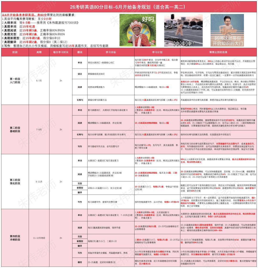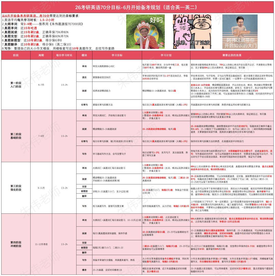 对于不同目标分数的同学,每个阶段,我也都做了详细的计划表格: